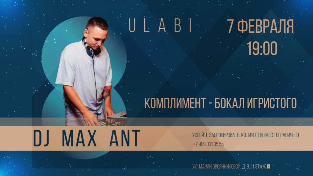 7 февраля ресторан ULABI заговорит языком ритма — за пультом DJ MAX ANT. Глубокий, выверенный саунд, под который хочется замедлиться, ловить момент и наслаждаться каждой минутой.